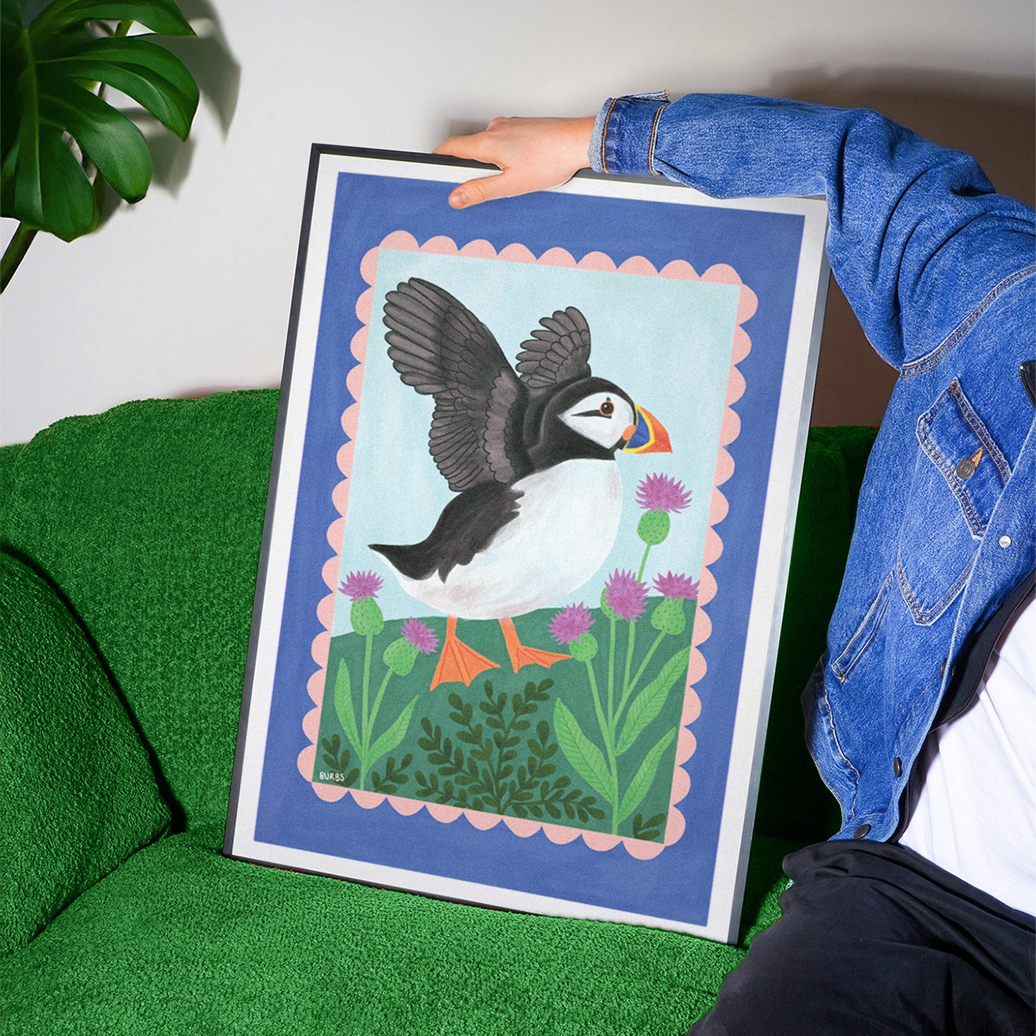 A bright and characterful puffin art print – perfect for anyone who loves wildlife, coastal birds, or bringing a touch of nature into their home. This hand-illustrated puffin by Jen Burbs is surrounded by soft botanical details, making it a joyful piece for any wall.